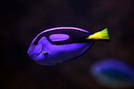 Pacific Blue Tang fish on a dark blue background.