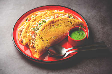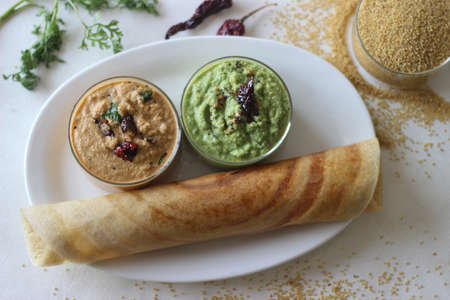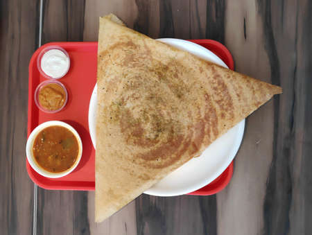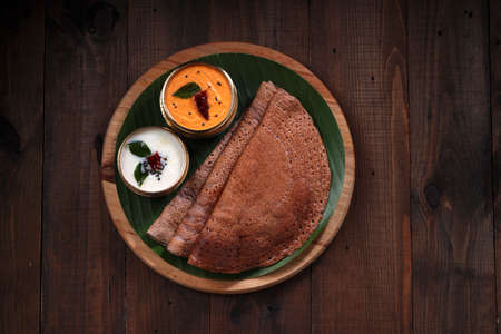 Ragi Dosa or finger millet dosa a south Indian traditional Breakfast served with chutney,sambar and potato masala topped with butter and served over a rustic wooden background, selective focus
