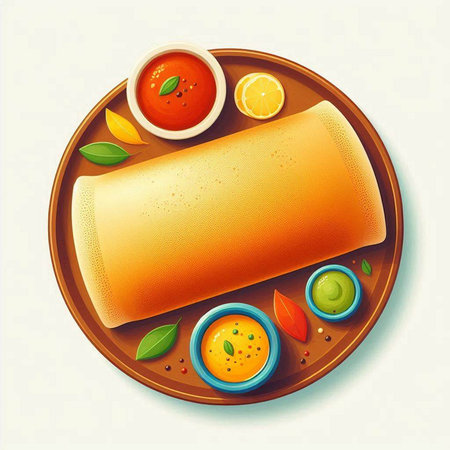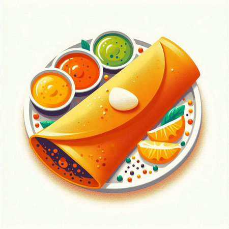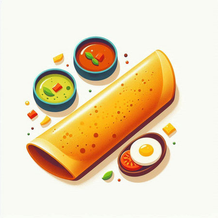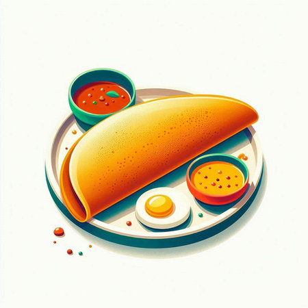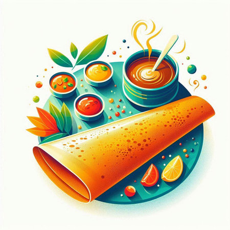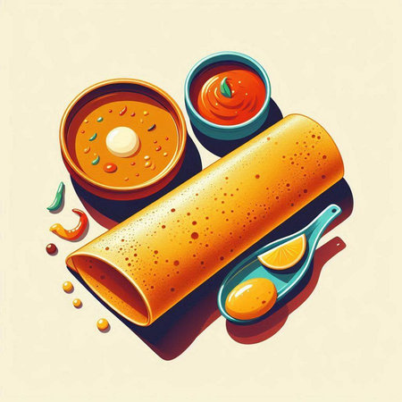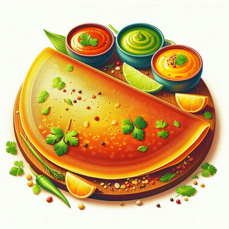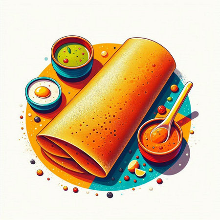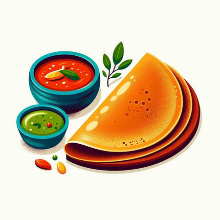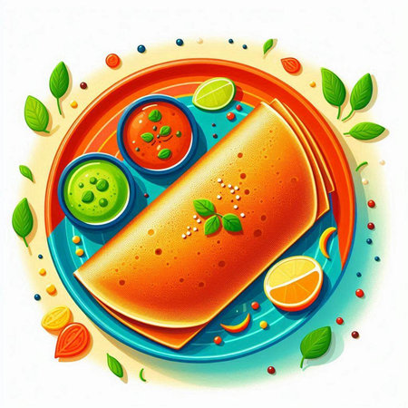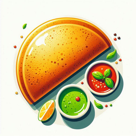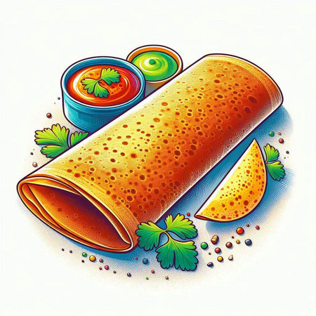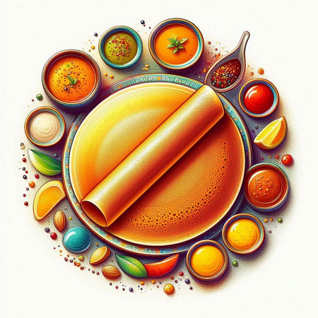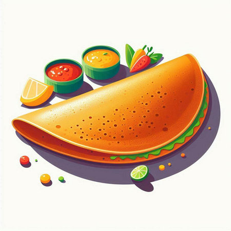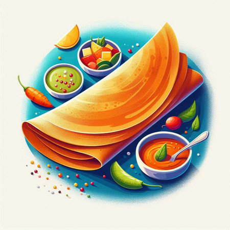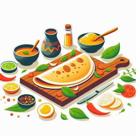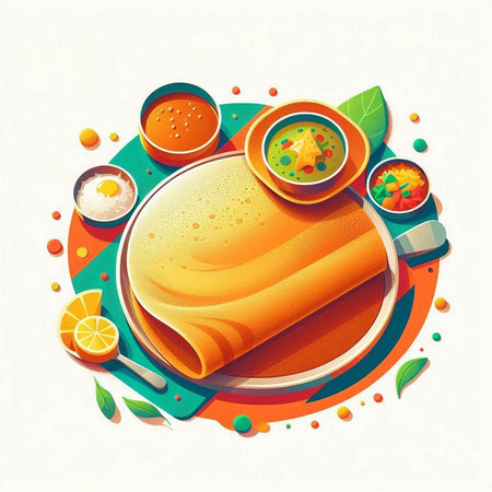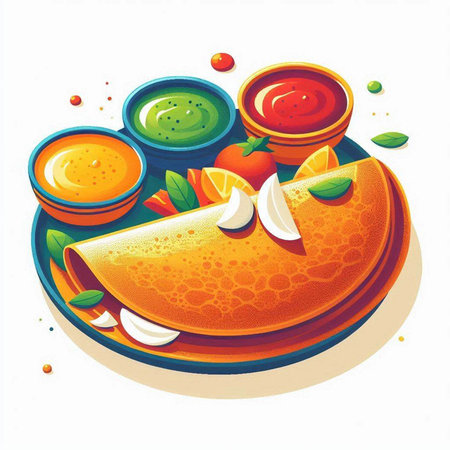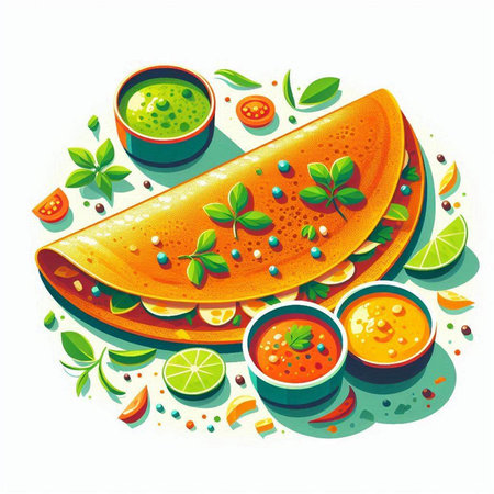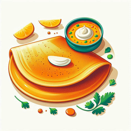 Illustration of a delicious Indian pancake with vegetables and spices.