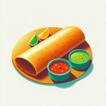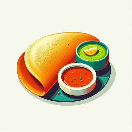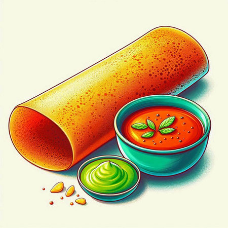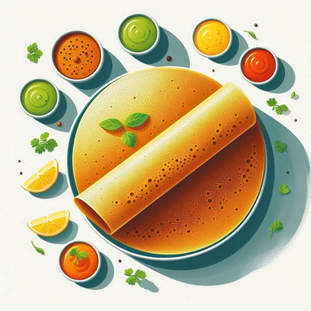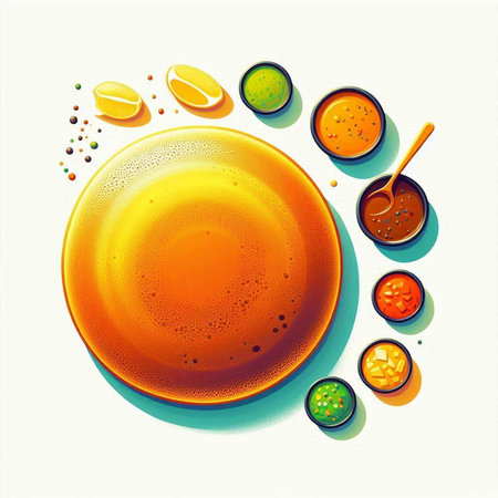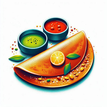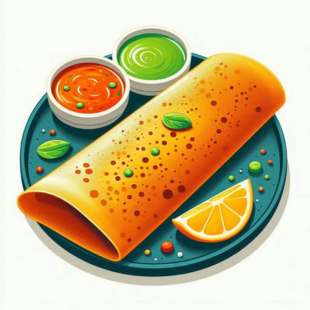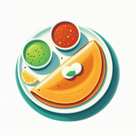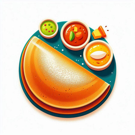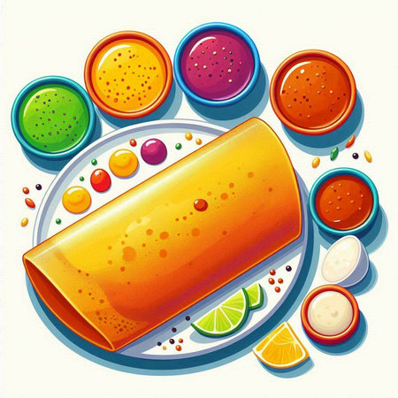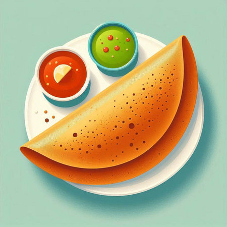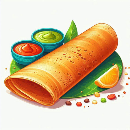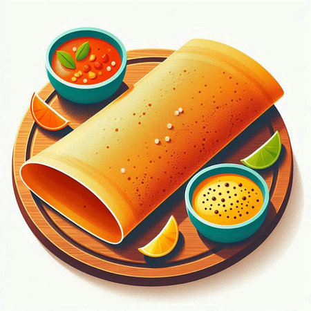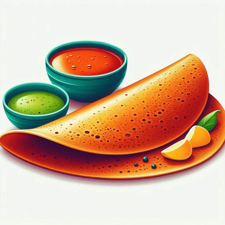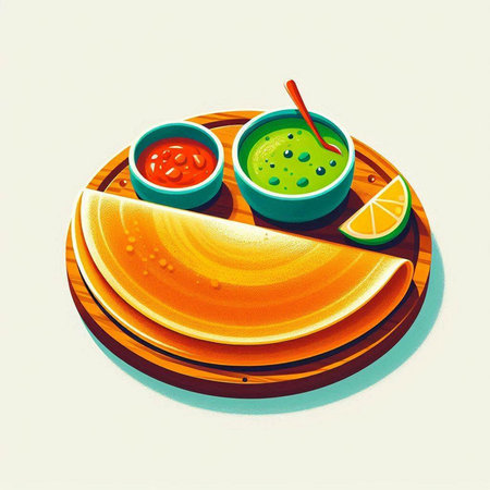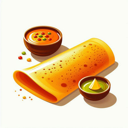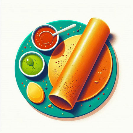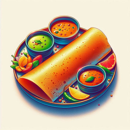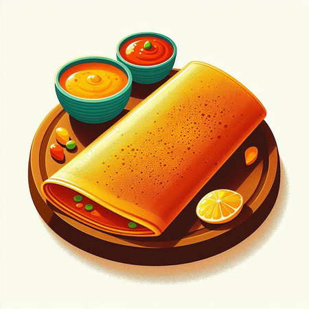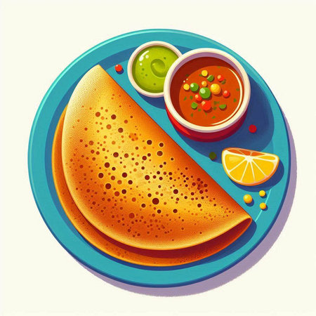 Illustration of a delicious Indian pancake with vegetables and spices.