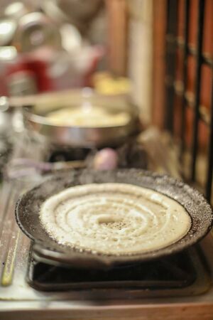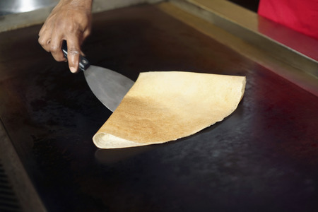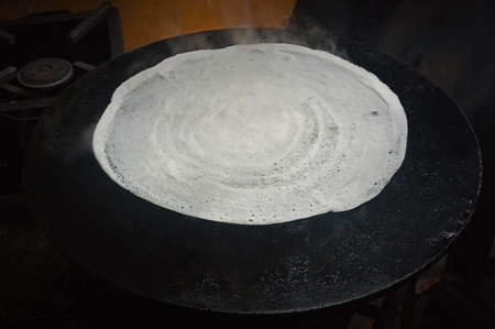 Dosa Indian food. cooking of Dosa in kitchen, India. South Indian vegetarian,