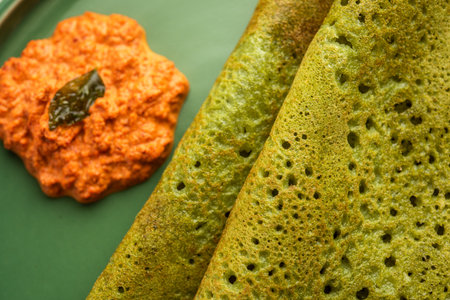 Palak dosa made using mixing spinach or keerai in batter, served with red chutney