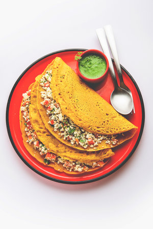 Sorghum Pancakes. Crispy pancakes made of whole grain Sorghum and lintels. Popularly known as Jowar dosa. Served with chickpea masala and condiments. Shot on white background