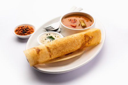 Masala dosa, a south Indian traditional and popular crepe with filling of a mixture of mashed potatoes and fried onions served with chutney and sambar over a rustic wooden background, selective focus