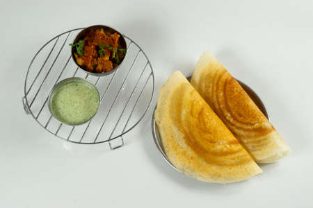 South Indian traditional breakfast Dosa or Thattu dosa made using cast iron dosa thawa, arranged in a tableware with side dish white coconut chutney and onion chutney on white textured background.