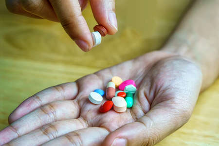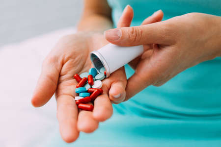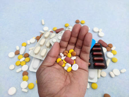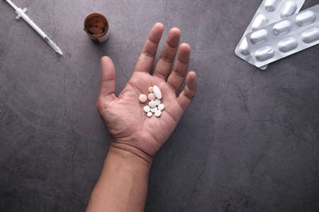 A person is holding a handful of pills. Medical and Health care concept