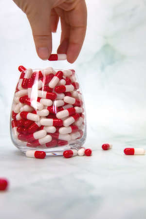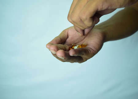 A hand grabbing hand full of medicines, Capsules for Vitamines,drugs,medication. Health,business concept
