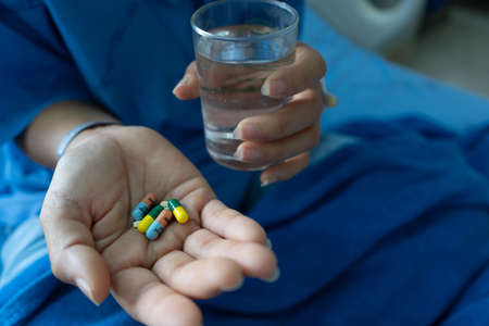 Blue dress woman on hospital bed Have medicine on hand