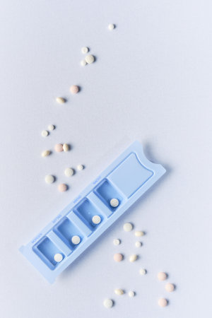 top view of medical pills in a pill box on white background