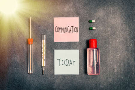 Word writing text Communication. Business photo showcasing a system whereby information is exchanged between individuals Set of medical equipment with notepad for health condition assessment