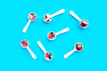 Wooden spoons full of pills, tablets, drugs, gel capsules. Blue background.