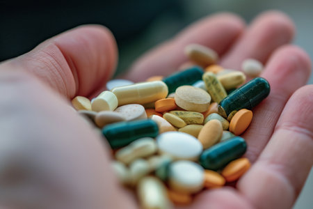 Close up view of hand holding a heap of multicolored variety of pills and capsules