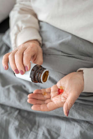 Sick senior woman laying at the bed with pills
