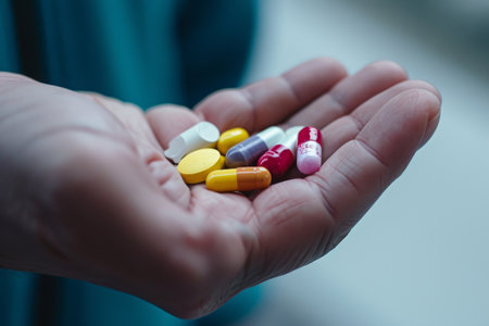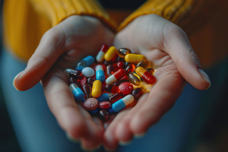 A person tightly grips a handful of pills in their hand, showcasing the importance of medication and healthcare, Scene inside a pharmacist's palm holding different types of opioid pills, AI Generated