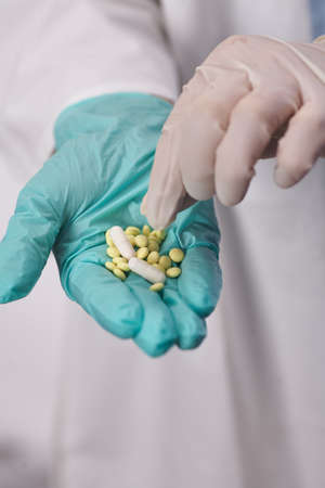 The pills are in the doctors hands. Hands in medical gloves hold pills. Medicine for the disease.