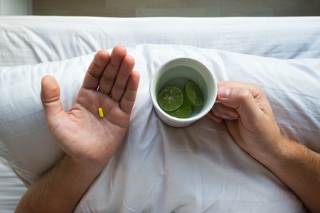 Man is going to eat medicine tablet - people with medical health problem concept