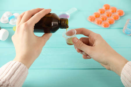 Woman pouring cough syrup into measuring cup at turquoise wooden table, closeup