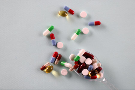 A collection of assorted pills arranged next to a silver spoon on a clean white surface.