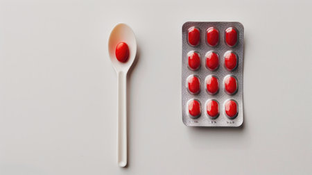 Spoon with pills on an isolated white background, concept of breakfast medicines.