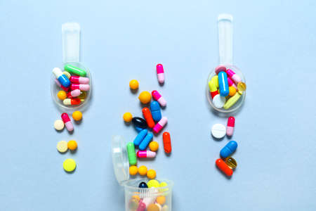 Colorful medicine pills, tablets and capsules on blue background. Copy space