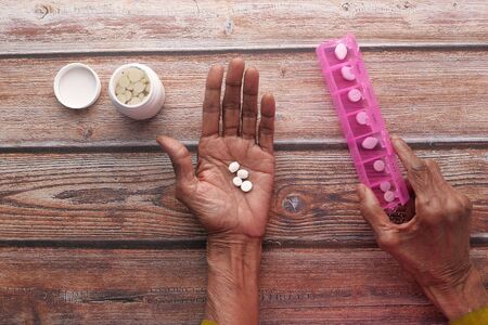 Female elderly hands sorting pills. Closeup of medical pill box with doses of tablets for daily take a medicine with white, yellow drugs and capsules. Young woman getting her daily vitamins at home.