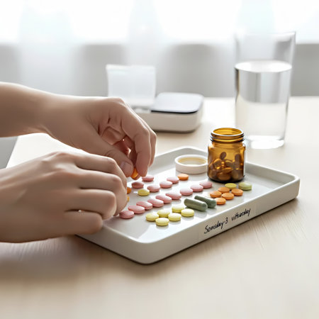 A hand holding a variety of colorful food supplement pills and capsules against a blurred kitchen background.