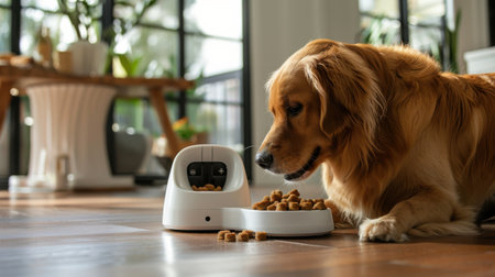 A golden retriever contentedly eats from a sleek automatic pet feeder in a cozy indoor setting, highlighting the intersection of technology and pet care for enhanced convenience.