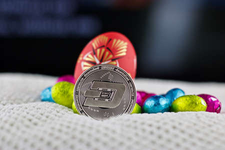 Digital currency physical silver metal dashcoin coin. Cryptocurrency concept.