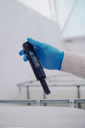 Scientist checks nutrient pH levels, Researcher measures plant solution pH accurately, Horticultural scientist precisely tests fertilizer and pesticide solutions in laboratory