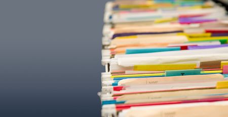Multi colored file folders showing signs of heavy use with gray copy space