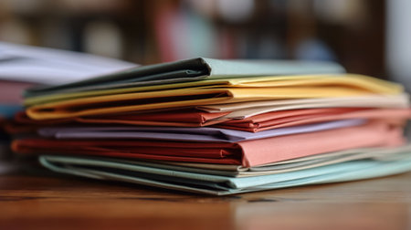 A selective focus shot capturing a stack of colorful paper files on a wooden desk, with a soft blur on the background enhancing the details in the foreground.