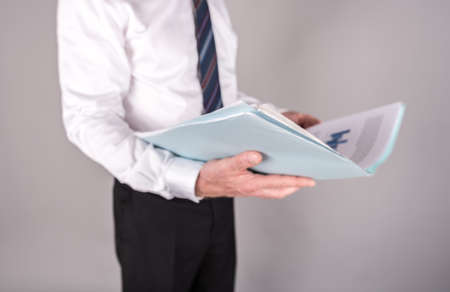 Businessman standing, reading a report, isolated on grey