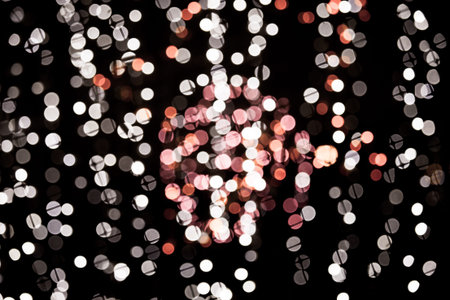 Red and white glitter bokeh lights on a dark background. Useful as an unfocused background. Copy space area available