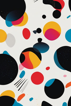 Brightly colored abstract artwork showcases a multitude of circles in various sizes and hues, creating a lively and dynamic composition on a textured background.