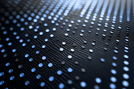 Abstract macro view of a dark textured surface with glowing blue dots arranged in a dynamic, flowing grid pattern, evoking a futuristic
