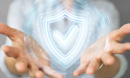 Woman on blurred background using digital shield protection blue holographic interface 3D rendering