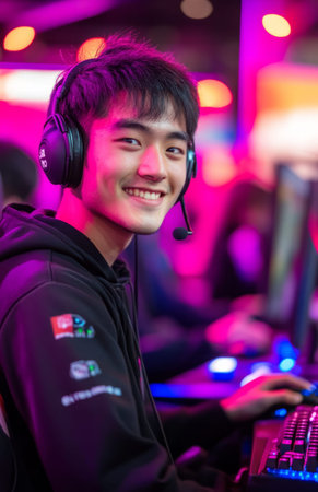 Portrait of young asian gamer at internet cafe. Professional gamer.