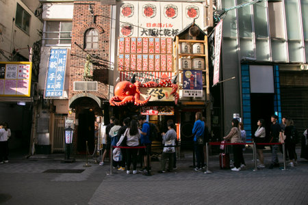 Osaka, Japan; 20th October 2023: Front of a Restaurant in Dotonbori district in the city of Osaka, famous for nightlife and food scene.