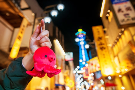 Pink octopus souvenir in hand at night in Shinsekai Osakas New World street by Tsutenkaku tower, Osaka, Japan. famous travel destination with illuminated fancy billboard or signboard