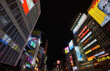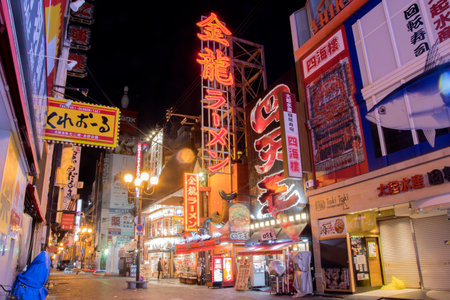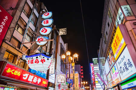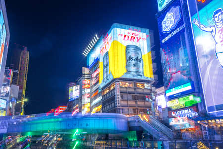 OSAKA, JAPAN - NOVEMBER 27, 2019 : Dotonbori walking street in the night with many neon light banner in Osaka city, Japan.