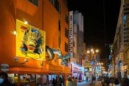 Osaka, Japan - February 2 , 2015 : Urban scene at night with many kind of retail and service store around Kansai area in Osaka , Japan