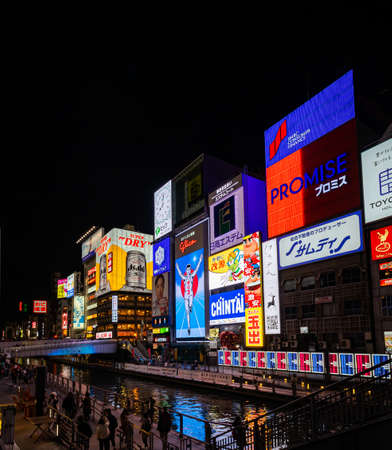 OSAKA, JAPAN -DECEMBER 1,2019:Advertisements beside the Dotonbori Canal in the Namba District. The canals date from the early 1600's and is a popular nightlife destination.