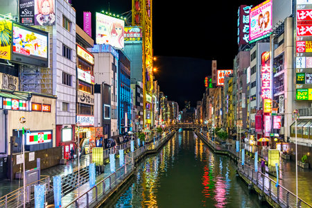OSAKA, JAPAN - OCTOBER 14, 2019: The bright night illumination over the Dotonbori canal in the Namba district of the city's Chuo ward. Osaka. Japan