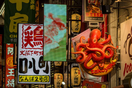 Osaka / Japan - March 19, 2018: Restaurant business sign in Dotonbori area of Osaka. Octopus symbolizes local delicacy - takoyaki, a ball-shaped snack made of a wheat flour, filled with octopus.