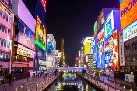 Osaka, Japan - April 29, 2014: Night view of Dotonbori canal. Dotonbori is one of the principal tourist destinations in Osaka and a popular nightlife and entertainment area