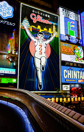 OSAKA, JAPAN - NOVEMBER 23, 2016 : The Glico Man billboard and other illuminated signboards in Dontonbori, Namba area, Osaka, Japan. Dotombori is popular nightlife and entertainment area in Osaka.