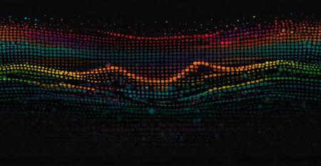 A vibrant display of sound waves represented by colorful particles, moving harmoniously against a black background to illustrate rhythm and energy.