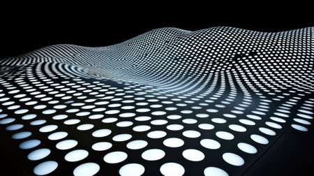 A wavy, pink-and-black perforated surface against a gradient blue background