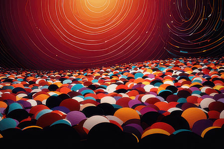 This abstract cosmic background features striking red circles and dynamic waves on a black backdrop, creating a visually captivating space-inspired design.