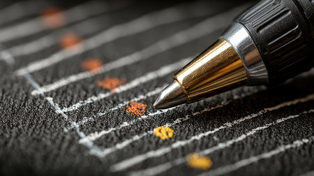 A gold-tipped pen resting on a marked surface with colorful details and patterns
